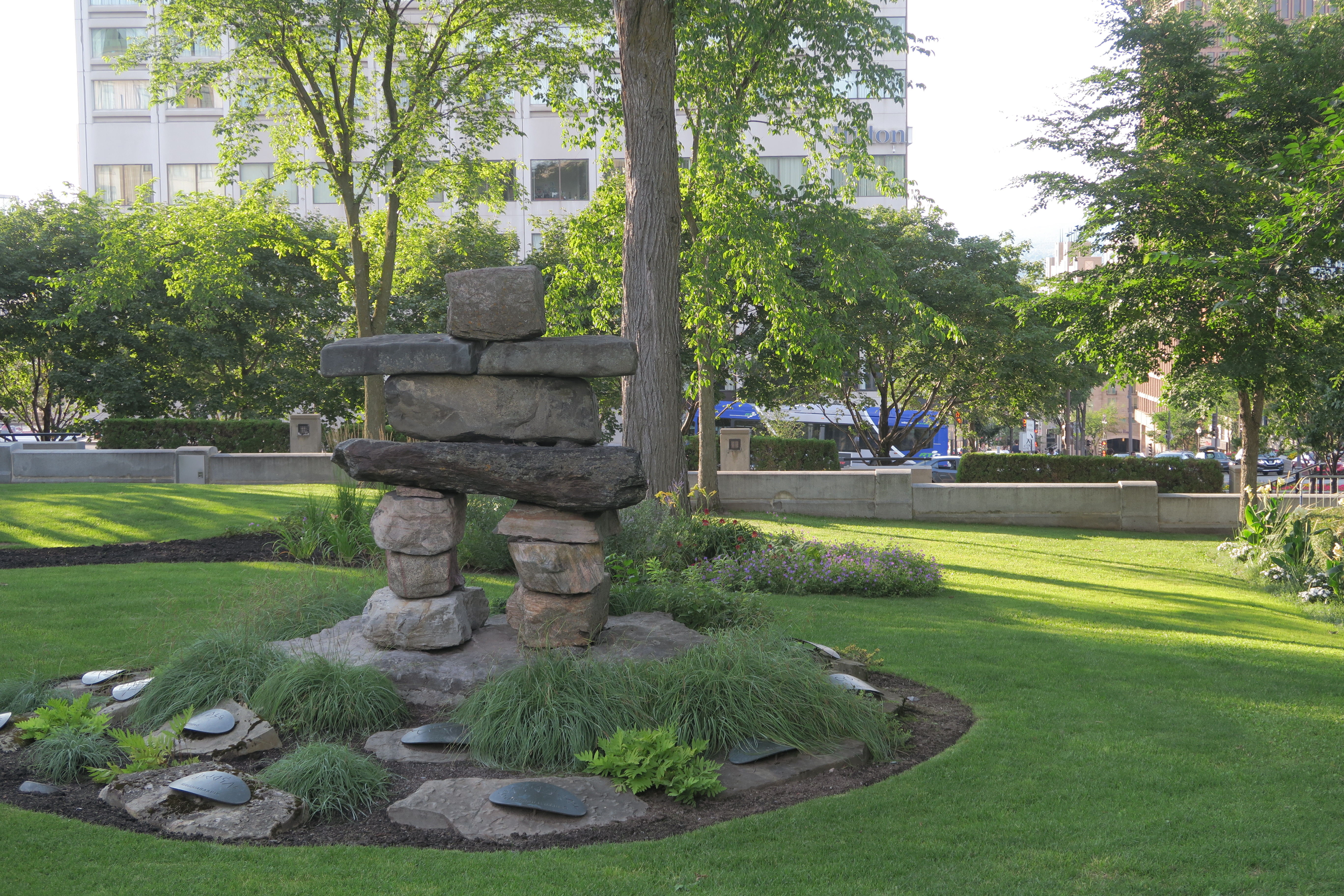 Un Inukshuk, sculpture traditionnelle des Inuits, symbole des premières nations au Québec, est bâtie devant le parlement pour montrer la bonne volonté du gouvernement envers les autochtones.