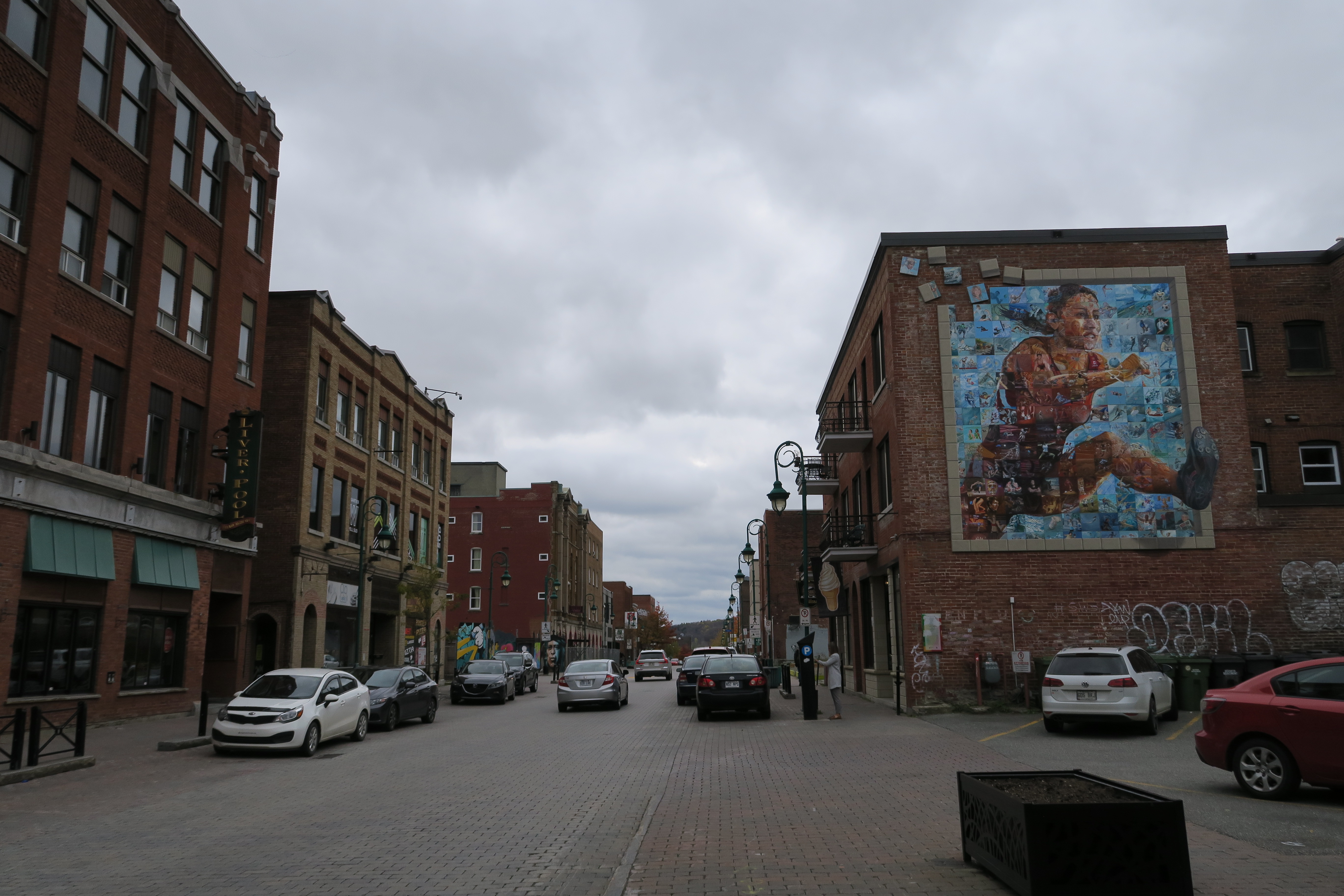 Le lendemain de mon arrivée, je pars à pied explorer la ville. Il m’a fallu environ 2 h 30 pour suivre le parcours des fresques et des monuments, une promenade qui m’a permis de découvrir le côté industriel et artistique de Sherbrooke, qui lui confère beaucoup de charme.