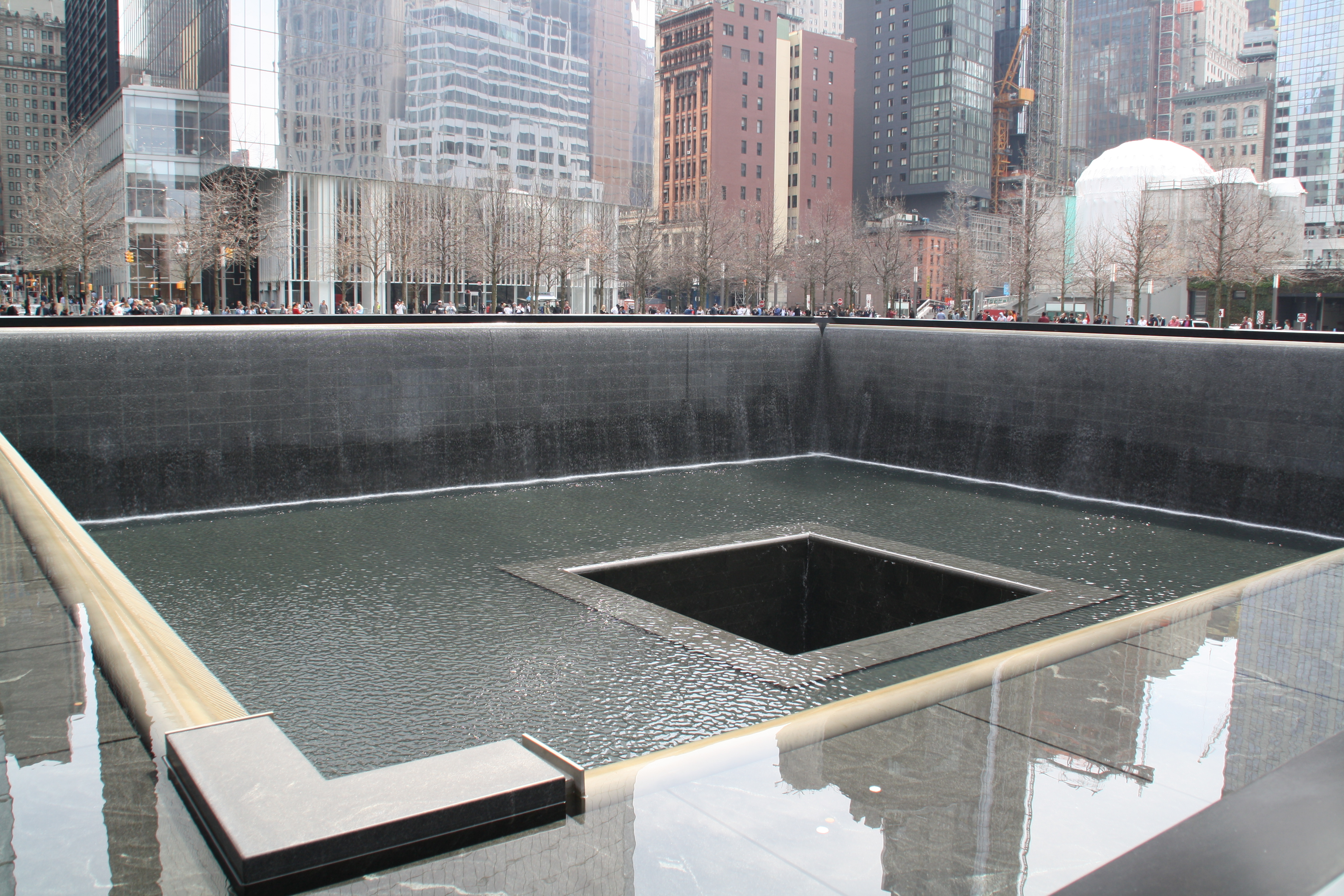 Nous commençons cette deuxième journée à Ground Zero, construit pour commémorer les victimes des attentas du 11 septembre 2001 ainsi que pour celles de l’attentat du 26 février 1993. Les deux bassins sont construits à l’emplacement même des 2 tours. Le One World Trade Center est maintenant là pour les remplacer.