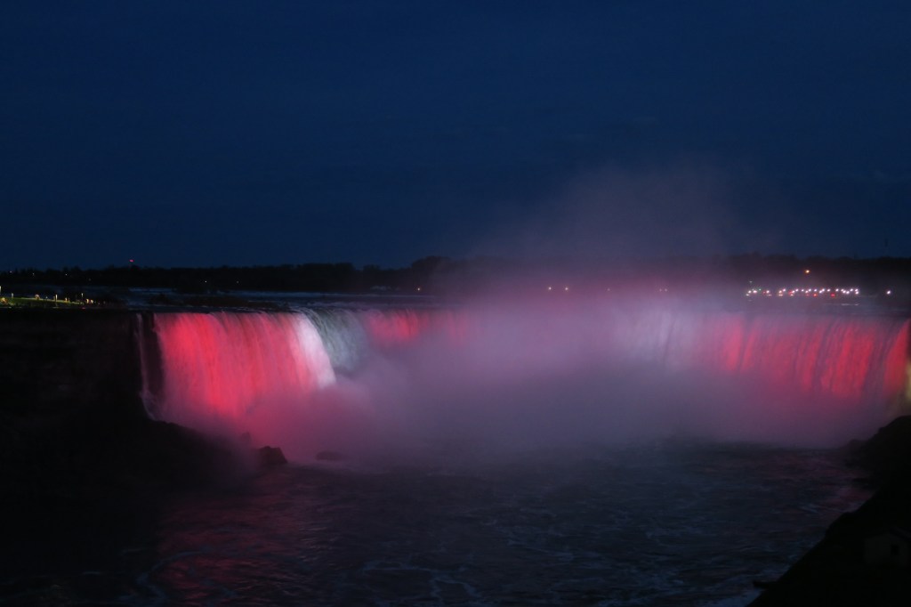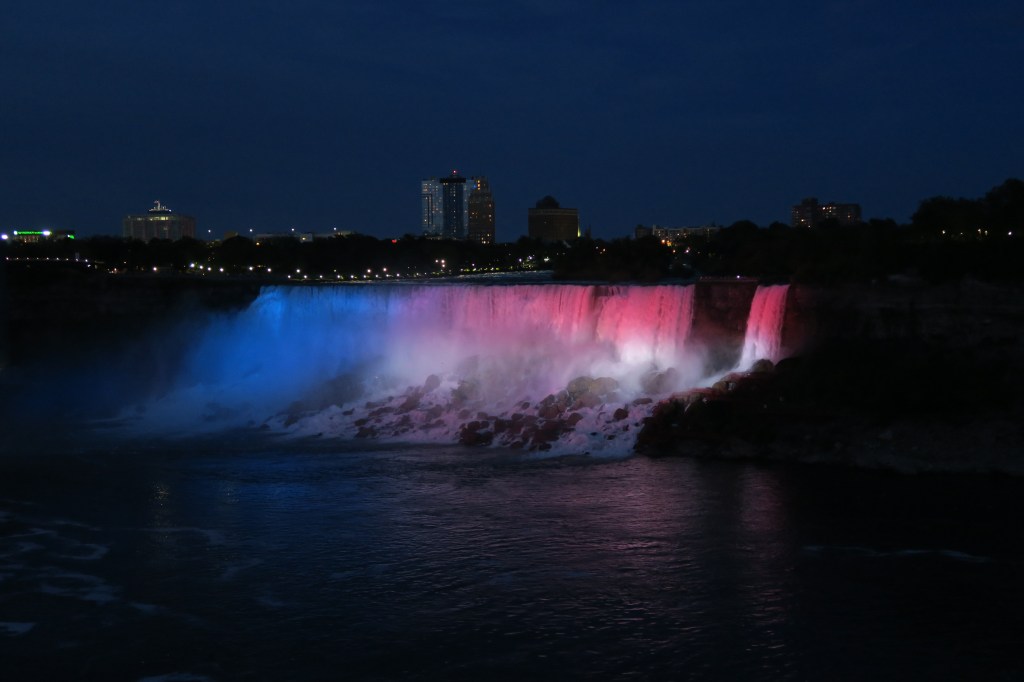 Le soir, les chutes s’illuminent avec les drapeaux du Canada et des États-Unis, et vers 22 h, un feu d’artifice vient émerveiller les visiteurs encore présents.