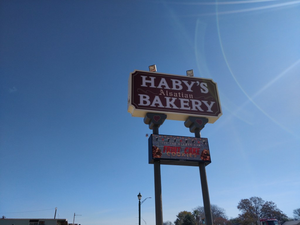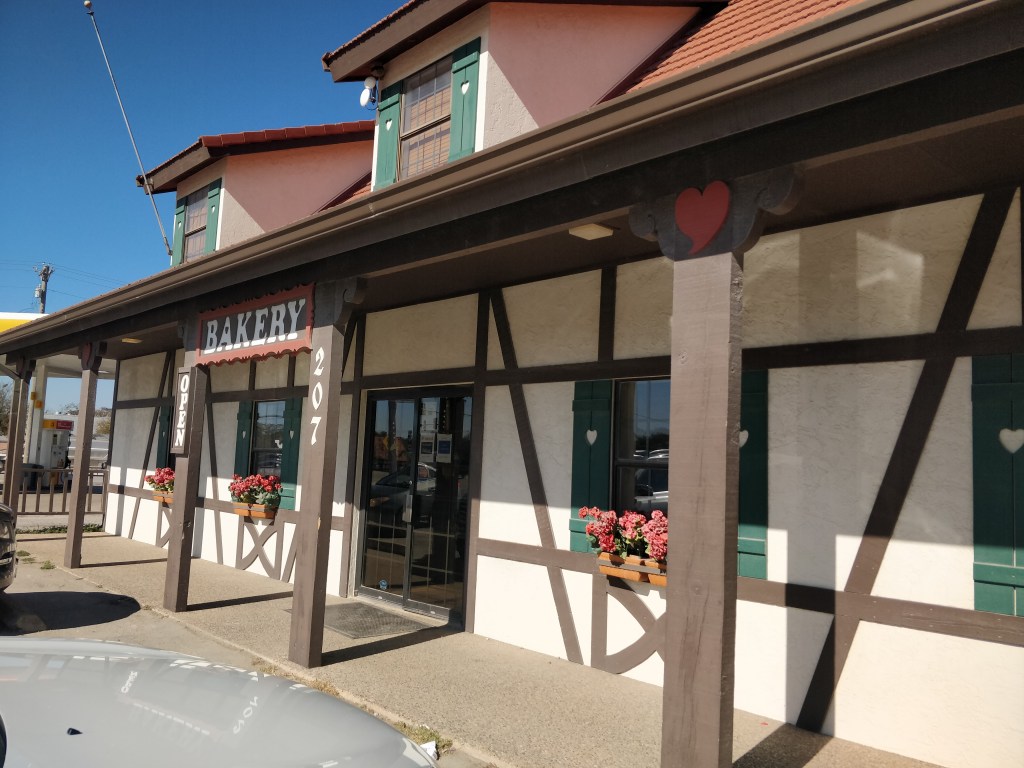 En face, la boulangerie alsacienne Haby’s n’a rien d’alsacien sur son étalage. Ni bredele, ni manele, ni torche au marron, ni même pâtisserie alsacienne ! Juste des donuts et des pâtisseries américaines bien grasses qui ne nous donnent pas envie … L’extérieur de la boulangerie est aussi orné de colombages et de fenêtres typiques d’Alsace. A l’intérieur, des tableaux et affiches rappellent les racines généalogiques du lieu. Lors de la fête annuelle du village, le dernier week-end d’avril, les habitantes ressortent les costumes et coiffes traditionnels d’Alsace.