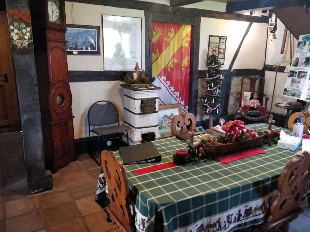 L’intérieur de la Steinbach house, la maison à colombages construite au XVIIe siècle au pays des cigognes, à Wahlbach (Bas-Rhin) est remplie de mobiliers comme nous pouvons le voir dans les maisons traditionnelles alsaciennes. Les multiples affiches et plaques de villages alsaciens donnent un aspect solennel au lieu et d’échange outre-atlantique.