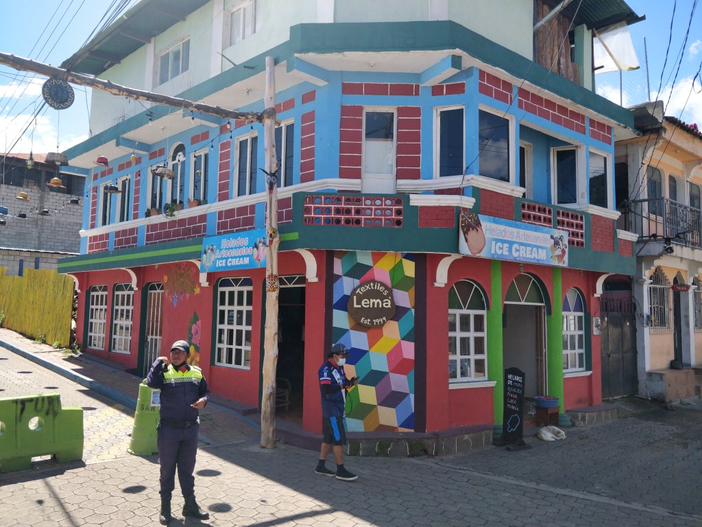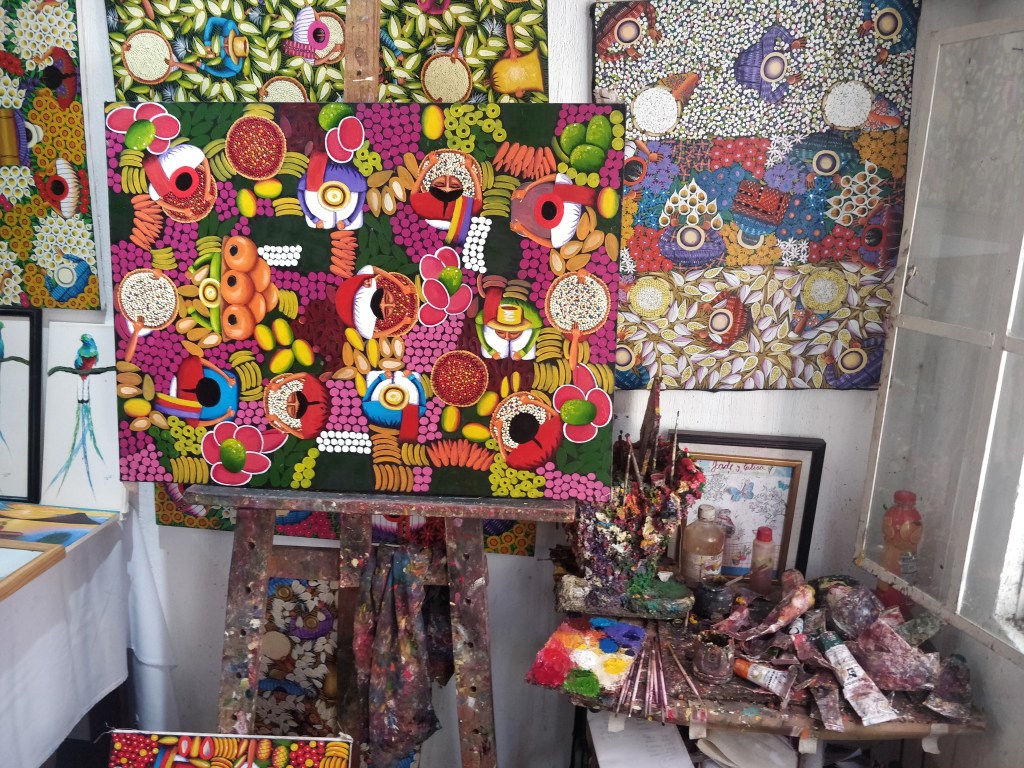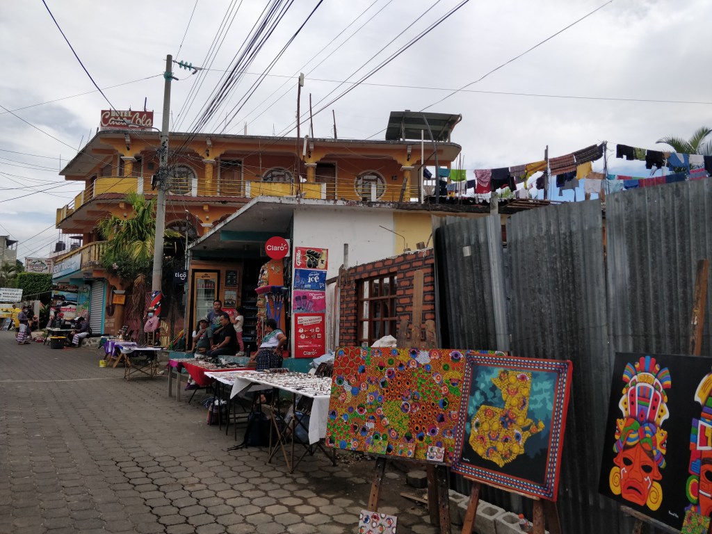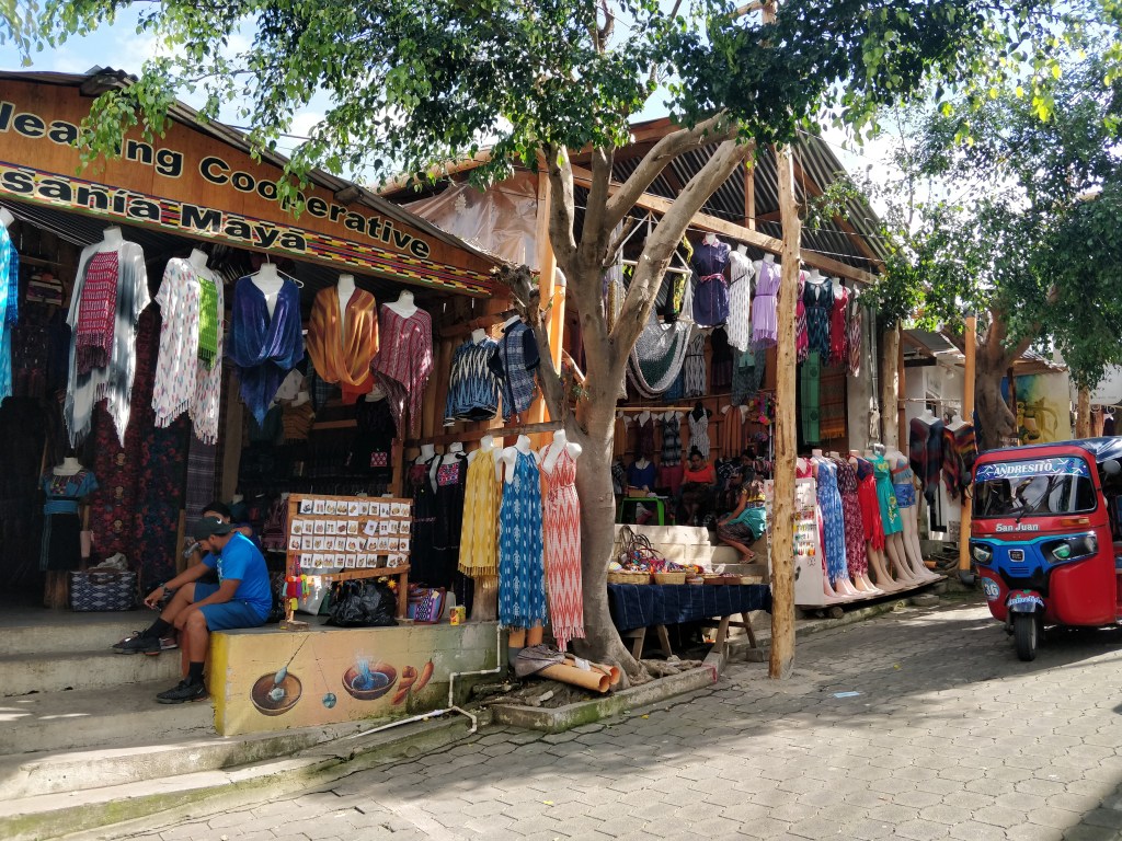 Ici c’est la communauté des mayas tz’utujil qui perpétue la tradition de la peinture représentant la vie rurale et des paysages aux couleurs vives. La rue touristique alterne des galeries d’art et petits cafés !