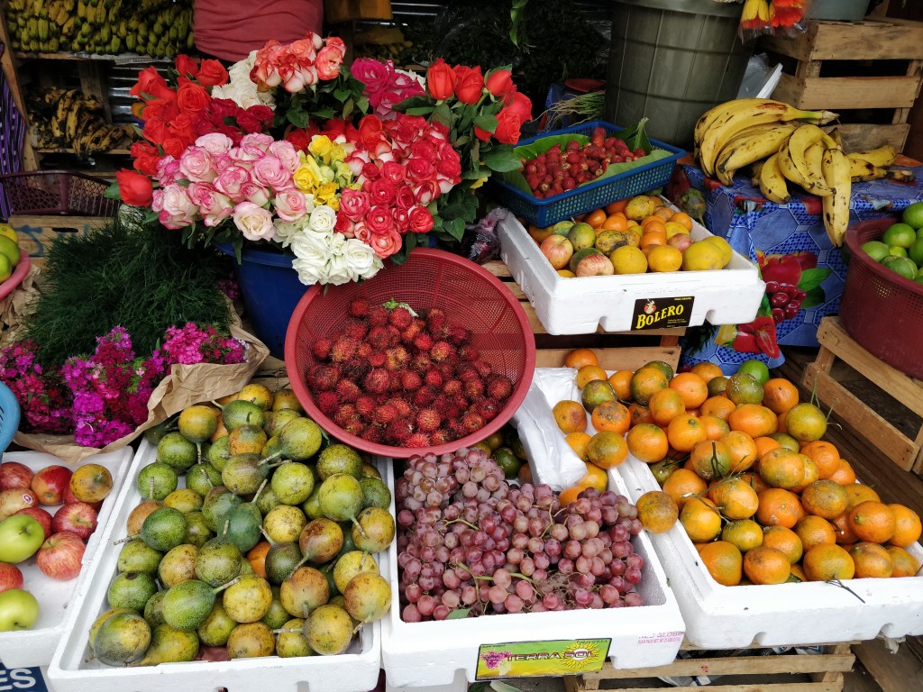 C’est le jour de marché. Fruits, légumes, bijoux et œuvres d’arts se marchandent et se négocient.