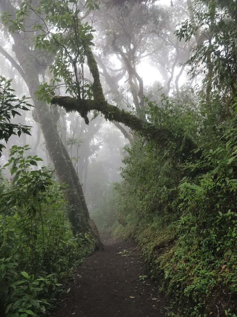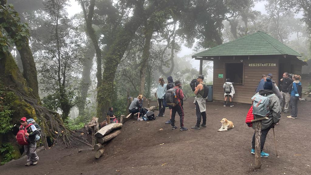 Après 1h30, nous atteignons la forêt dans une brume épaisse. Ici, se situe l’entrée du parc du Volcan Acatenango, l’entrée coute 50QTZ.