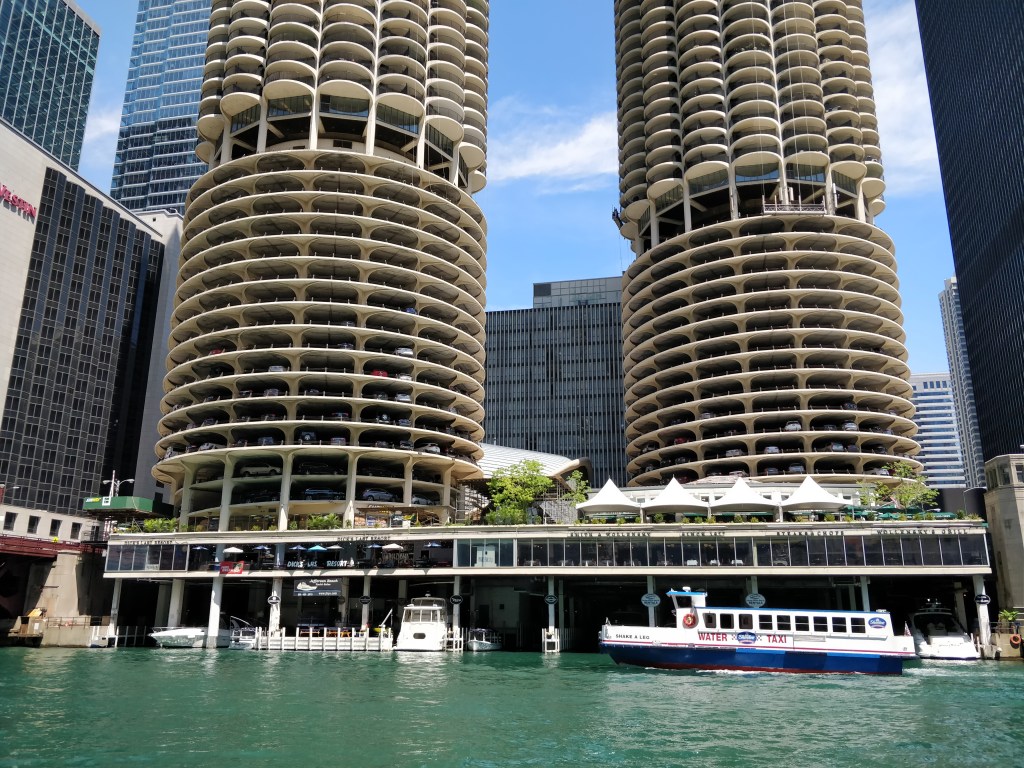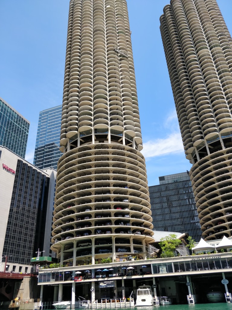Les tours jumelles de Marina City et leur forme d’épis de mais sont indissociables avec les tours qui les entourent. Ces tours remplies de bureaux et de résidences ont tout de même 16 étages de parking !