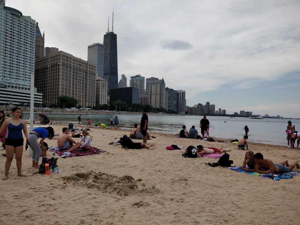 Nous continuons de remonter la rue jusqu’à atteindre la plage urbaine de l’Ohio Street Beach. Située sur les bords du Lac Michigan, elle est la 5ème plage la plus grande du monde ! Chicago laisse paraitre une ambiance de ville balnéaire plutôt agréable, aux pieds des buildings.