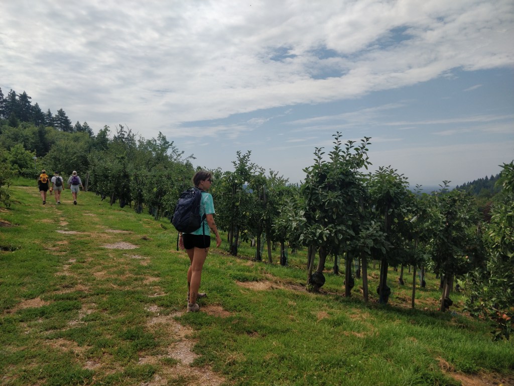 Avec 400 mètres de dénivelé, le début de la randonnée dans les vignes et champs de pommes est plutôt physique par rapport au reste du parcours.
