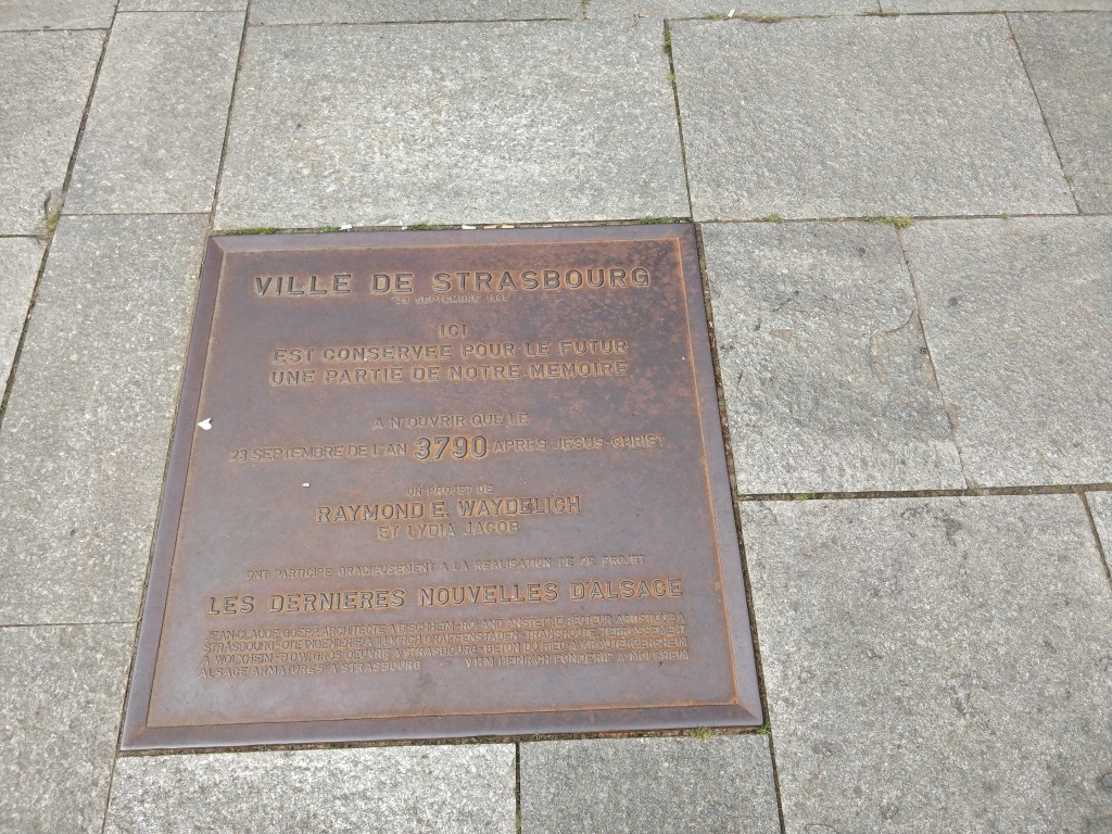 Sur le parvis du monument strasbourgeois, un bunker avec 12 tonneaux d’objets du quotidien de la fin du XXème siècle est destiné aux archéologues du futur.