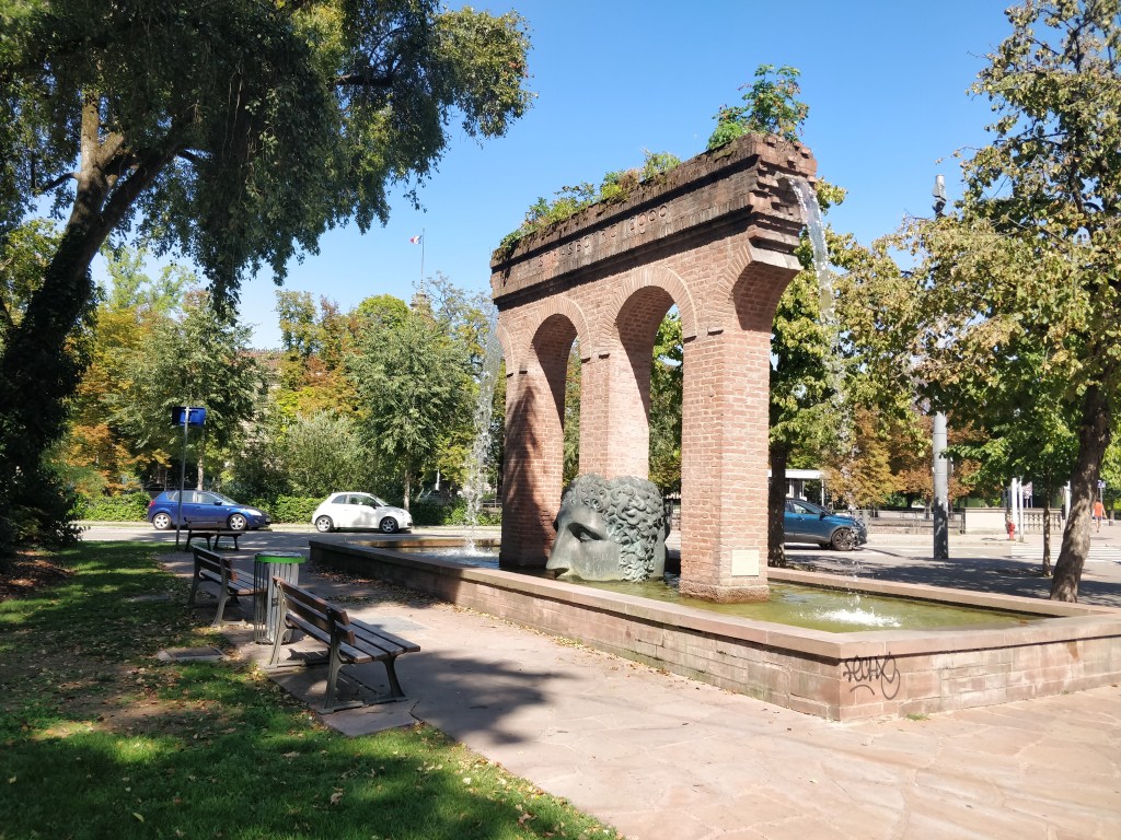 Un petite fontaine face à un monument aux morts de la guerre de 1870 se trouve dans les jardins de la haute école des arts du Rhin.