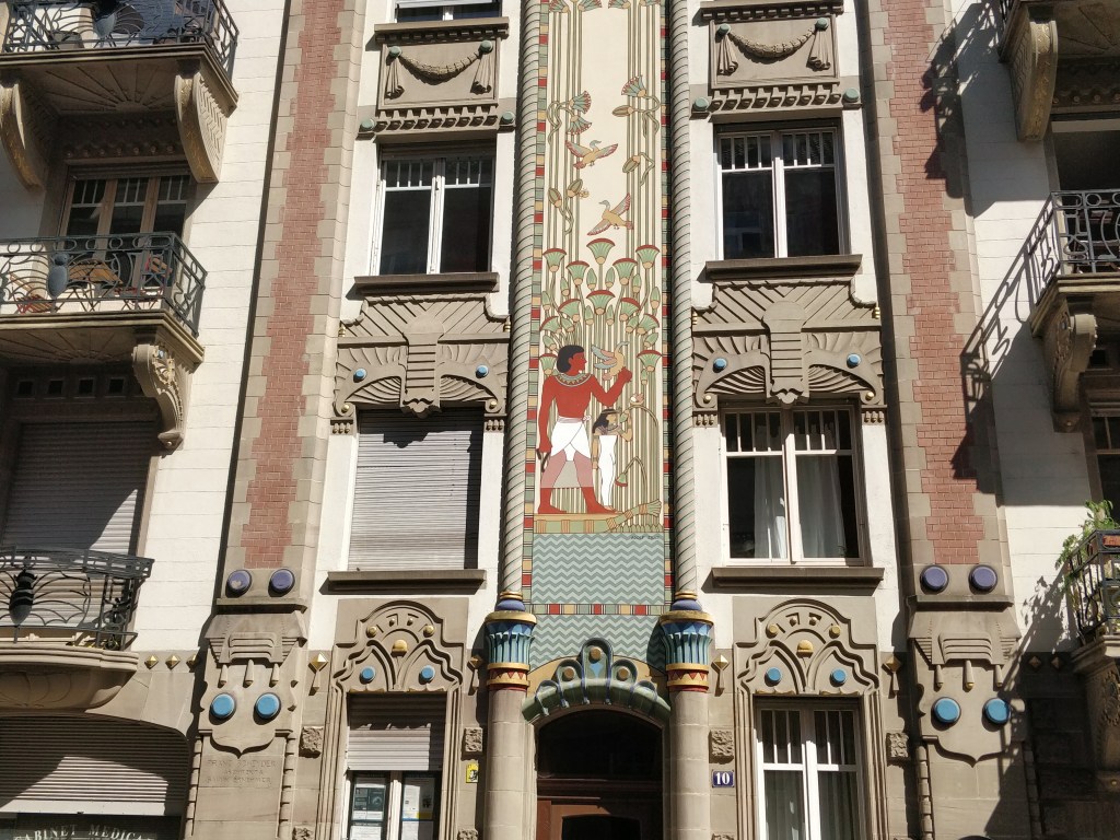 Avec une grande fresque centrale, l’architecte a voulu idéaliser l’art égyptien dans un style Art Nouveau. La maison fut construite début du 20ème siècle, dans une époque où l’égyptologie venait de naitre et fascinait les Européens.