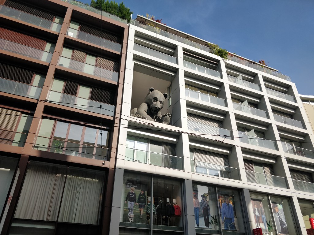 Depuis 2015, un ours monumental surveille la rue du noyer entre la place de l’Homme de Fer et les Halles.