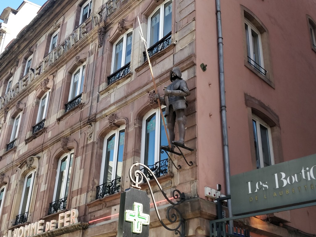 Au dessus de la croix verte de la pharmacie, tu trouveras une statue grandeur nature d’un sergent de patrouille en armure. Au 18ème siècle, à la place de la pharmacie se trouvait l’armurerie municipale. Depuis, la place a pris le nom de l’homme de fer qui trône sur la devanture.
