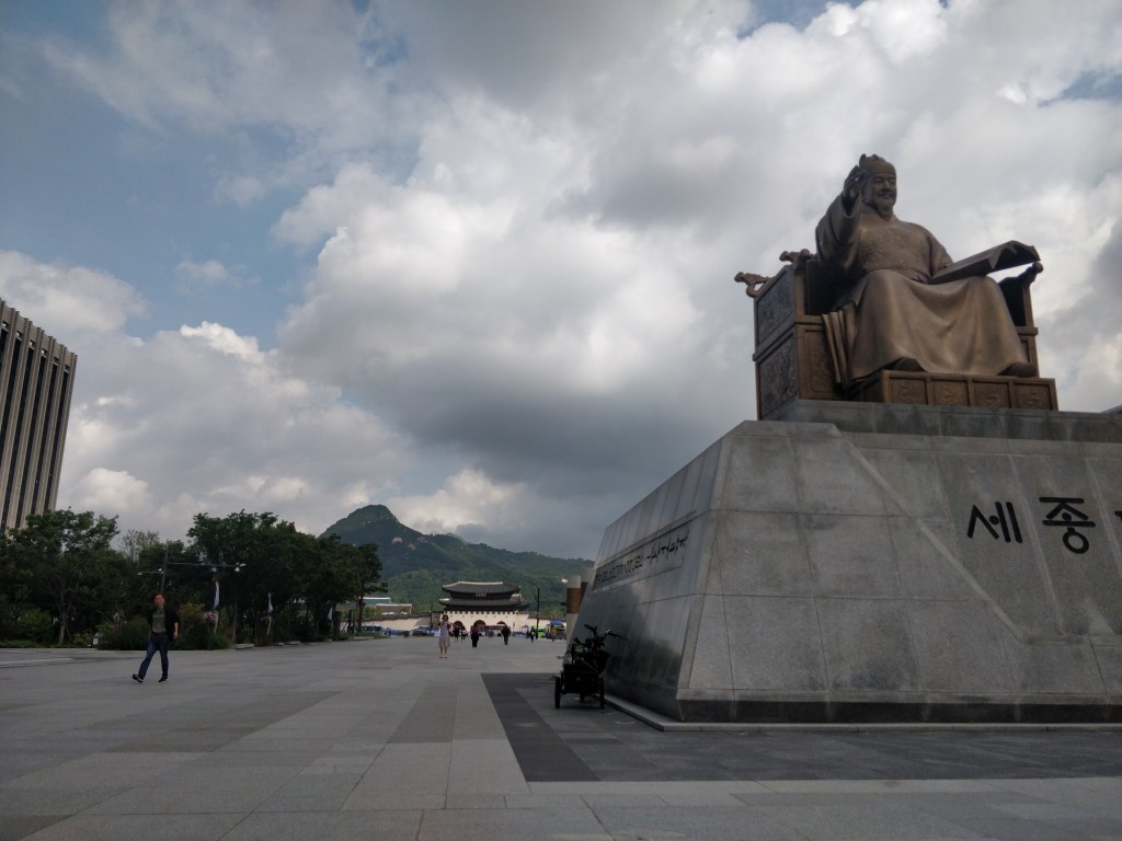 Nous atteignons la place Gwanghwamun depuis la promenade Cheonggyecheon. La première chose que l’on peut admirer en arrivant sur cette place est la statue du roi Sejong et de l’amiral Yi Sun Shin, avec en arrière-plan le magnifique palais Gyeongbokgung.