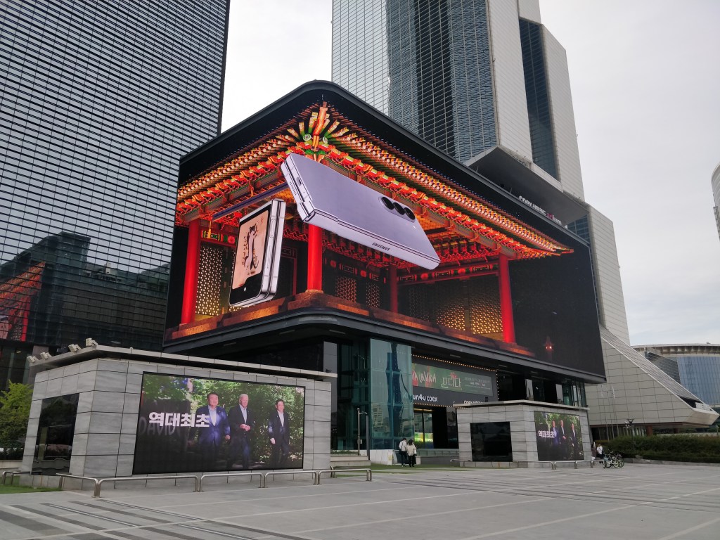 À l’extérieur, l’écran géant incurvé installé par Samsung affiche des publicités en 3D saisissantes ! Nous avons dû attendre 30 minutes avant d’en voir une !